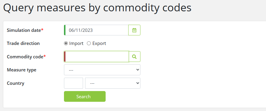 To find measures by commodity codes, enter the relevant data into the fields according to the following table: