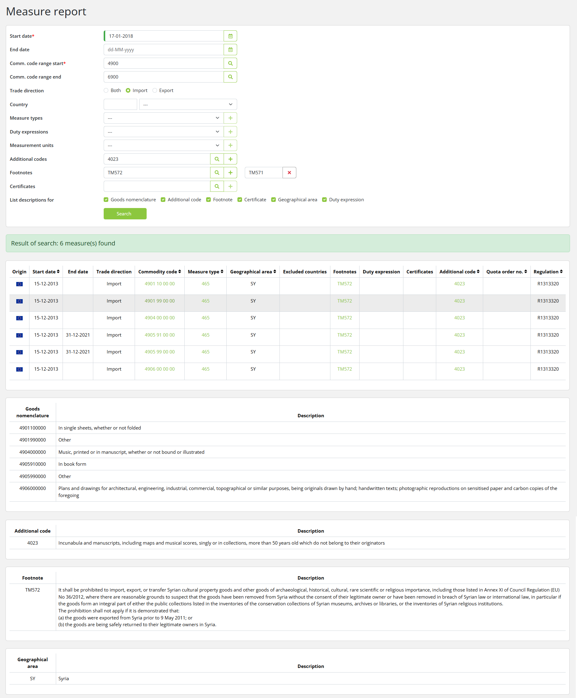With this option, you can query all actual measures not declarable, based on any combination of any attributes of a measure, including dates, commodity codes, country, measure types, additional codes, certificates and footnotes.