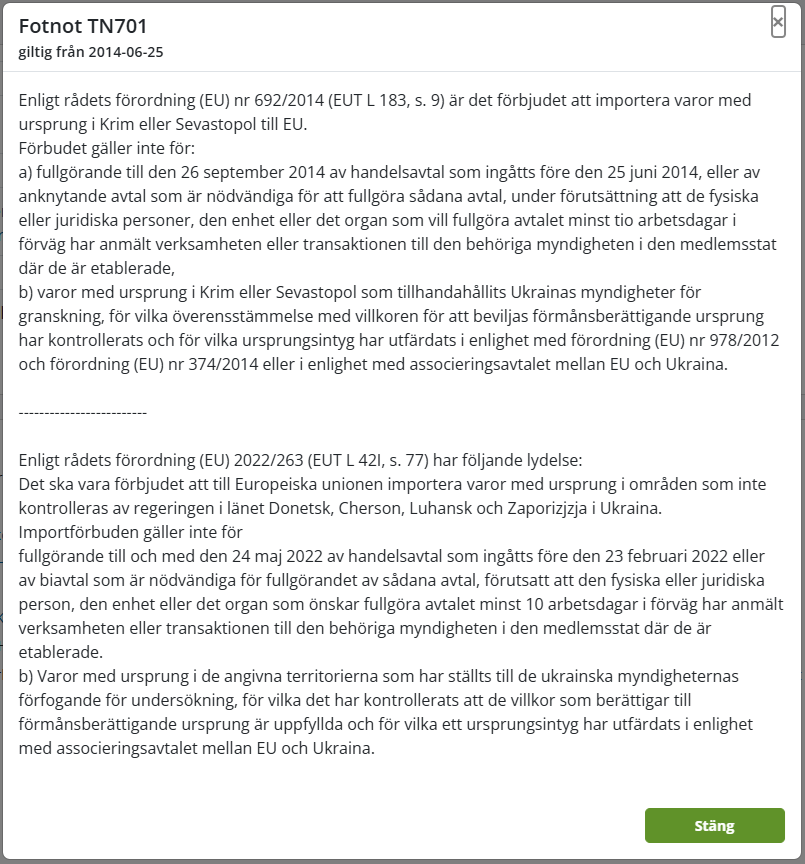 Fotnotskoderna visas efter beskrivningarna (t.ex. TN701). Ett klick på koden öppnar ett fönster med beskrivningen över fotnoten.
