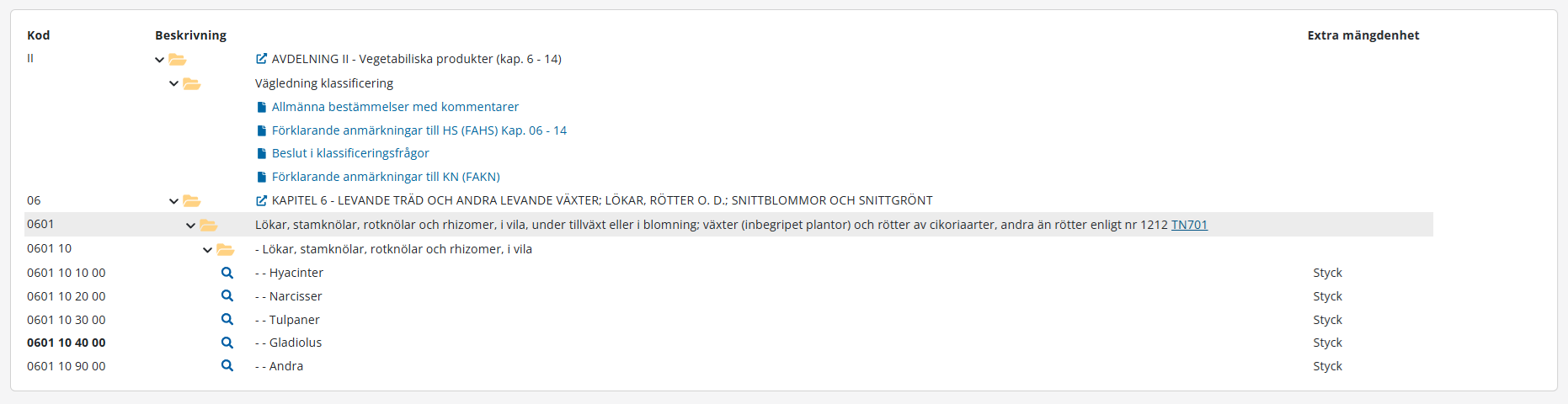 När denna box är ifylld visas sökresultatet för ett fullt expanderat varukodsträd baserat på de villkor som angivits.