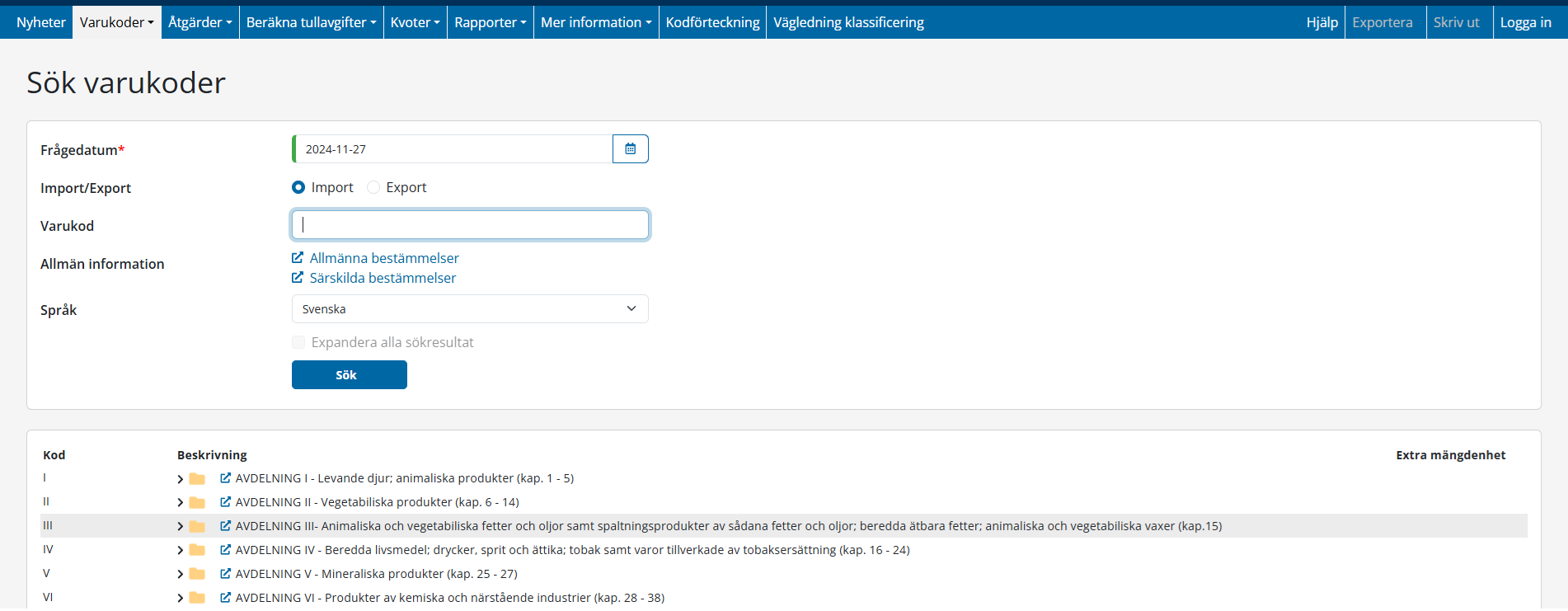 Detta område visar varukodsträdet, organiserat i sektioner. Som standard är den inställd till importläge med dagens datum som den dag då frågan. För varje avsnitt, kommer du att se den romerska siffran (t.ex. "VII"), titeln och kapitlen i avsnittet.