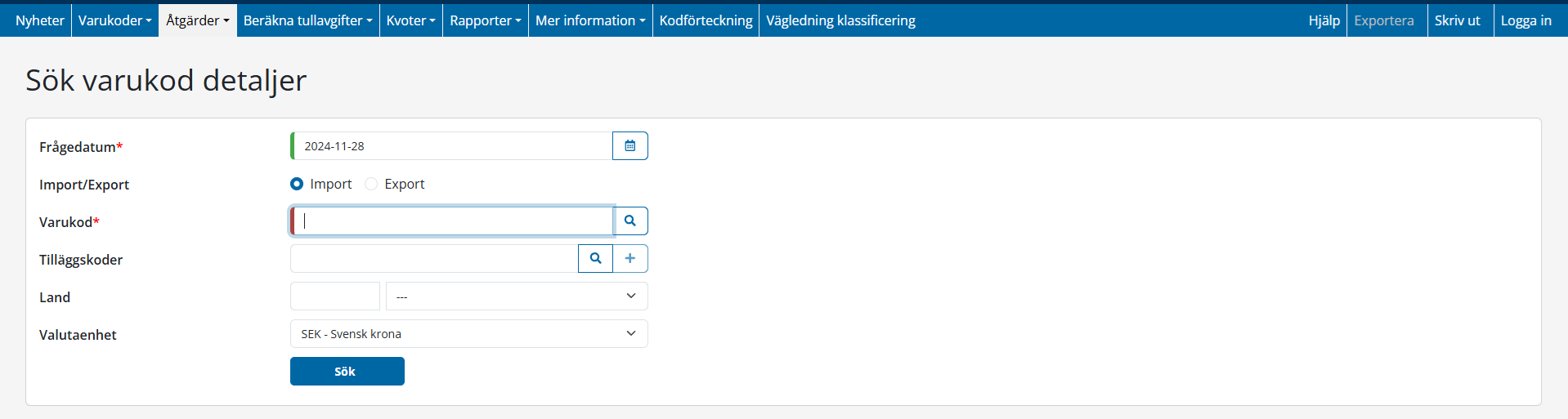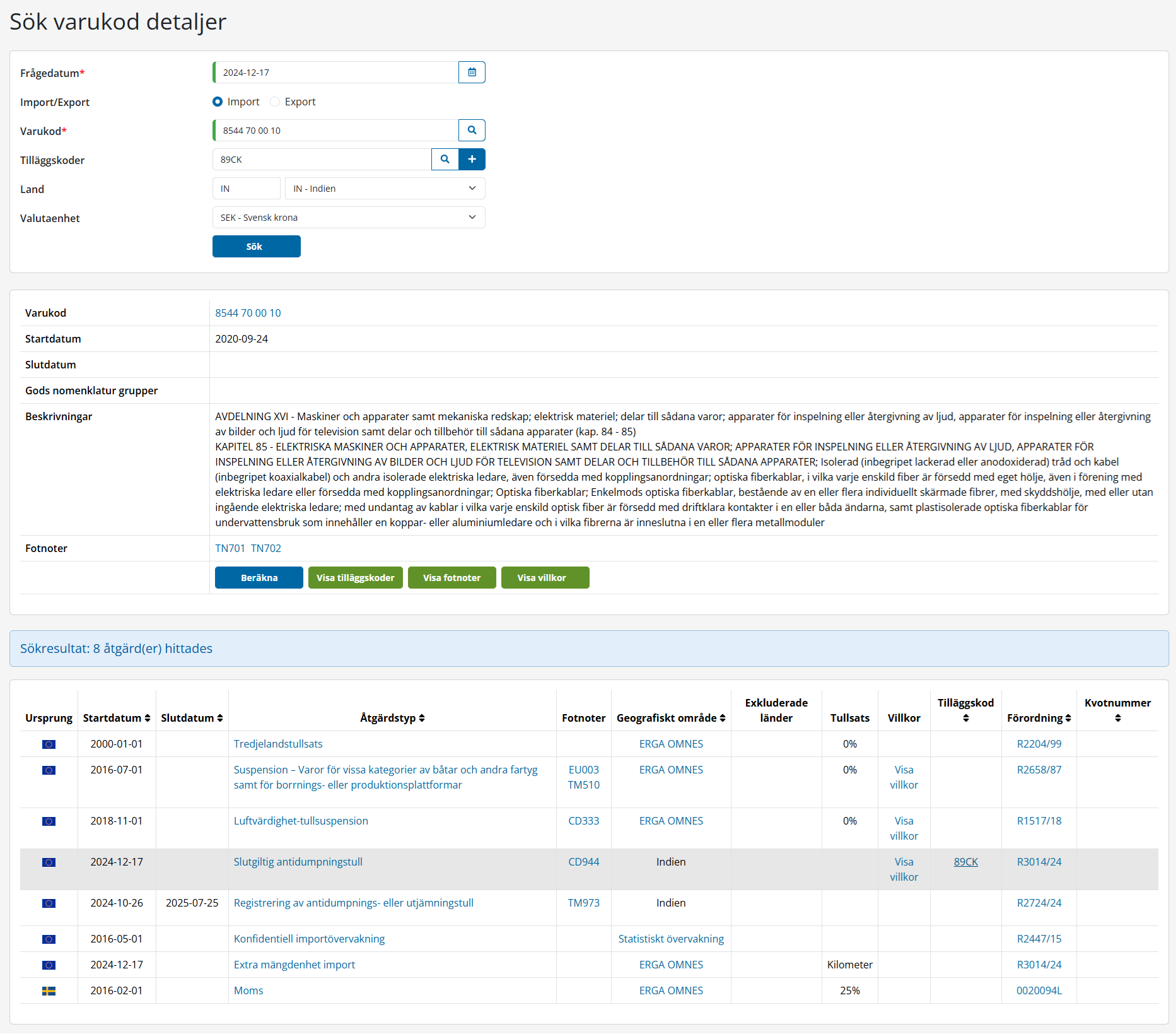 Här kan du söka efter de åtgärder som gäller för en varukod. Du kan också filtrera sökningen utifrån angivna kriterier (till exempel ytterligare tilläggskoder).
