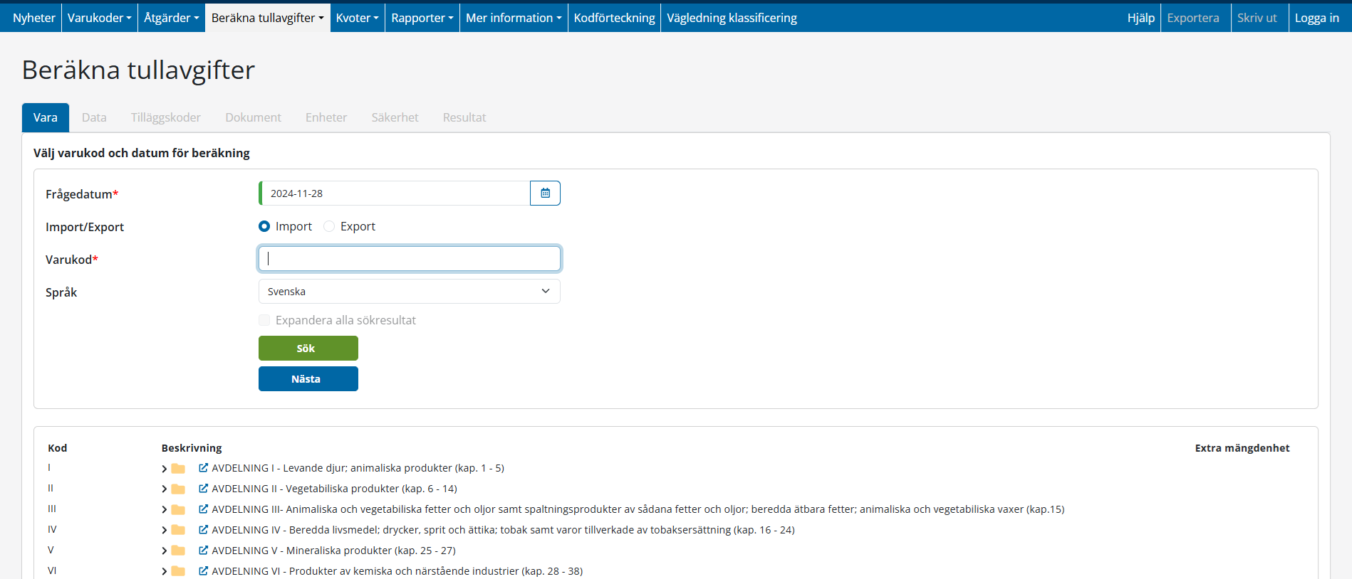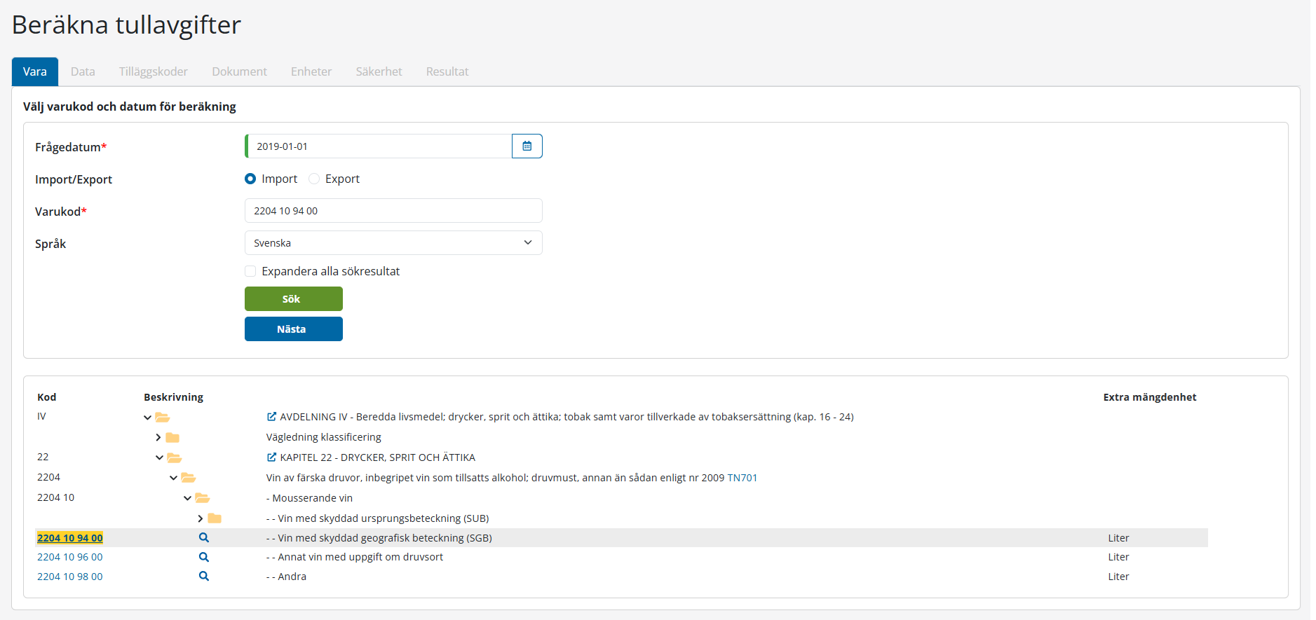Ange den varukod du vill använda eller sök efter koden genom att utforska i varukodsstrukturen i den nedre delen av sidan.