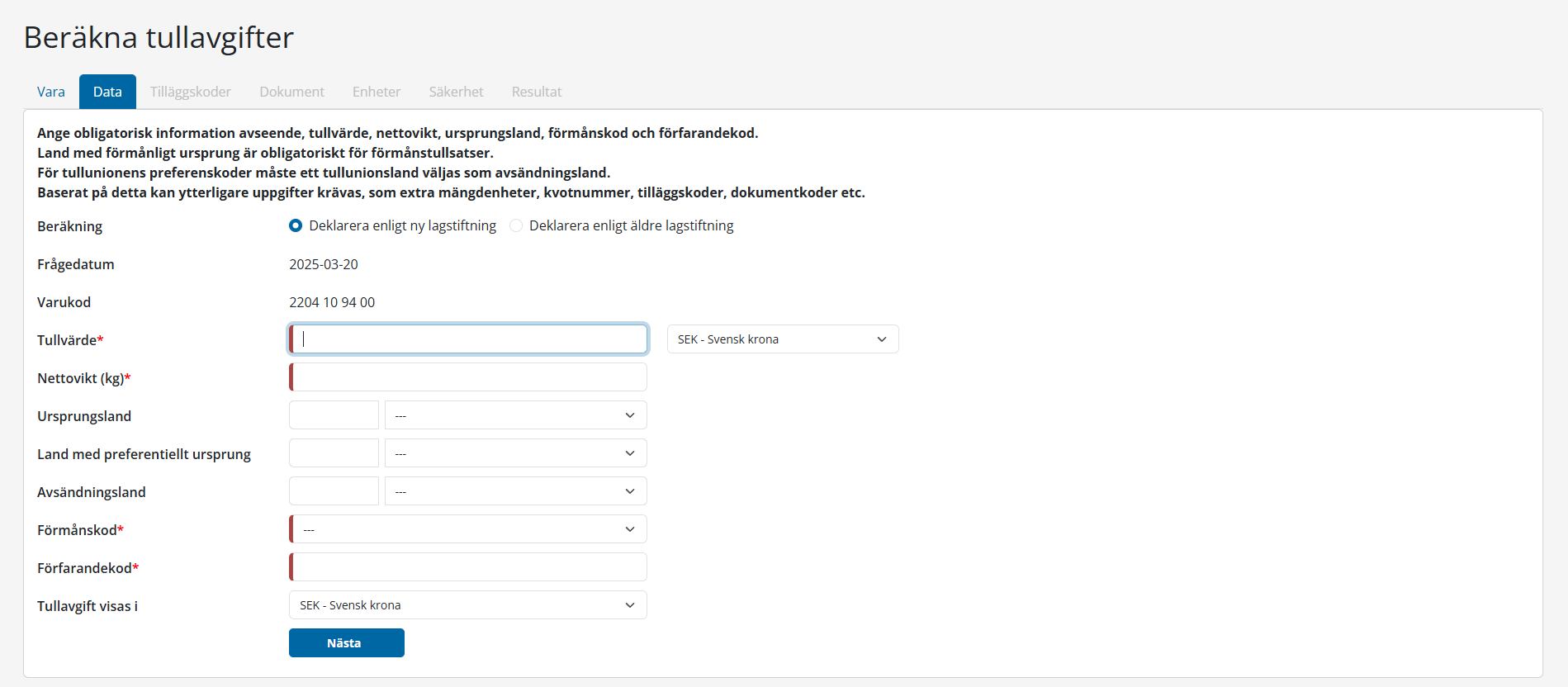 Baserat på det valda GUI: ”Deklarera enligt ny lagstiftning” eller ”Deklarera enligt äldre lagstiftning” kan du bli ombedd att ange ytterligare parametrar. För Deklarera enligt ny lagstiftning har datafliken ytterligare två parametrar: Land med förmånligt ursprung och förfarandekod.