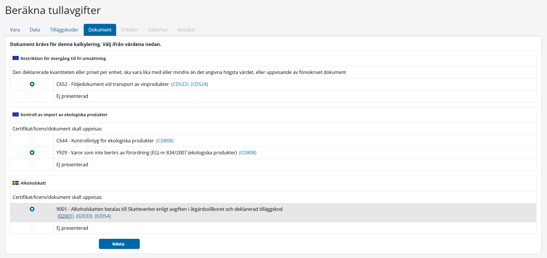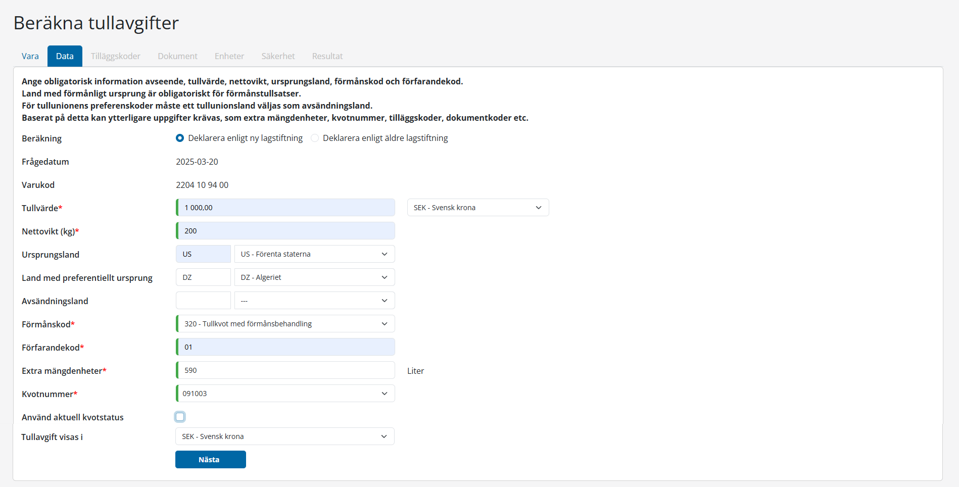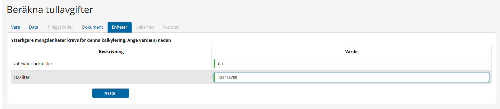 I detta steg skall all obligatorisk information anges såsom tullvärde, nettovikt, land. Baserat på dessa värden kan du bli anmanad att även ange extra mängdenhet, kvot eller avsändarland.
