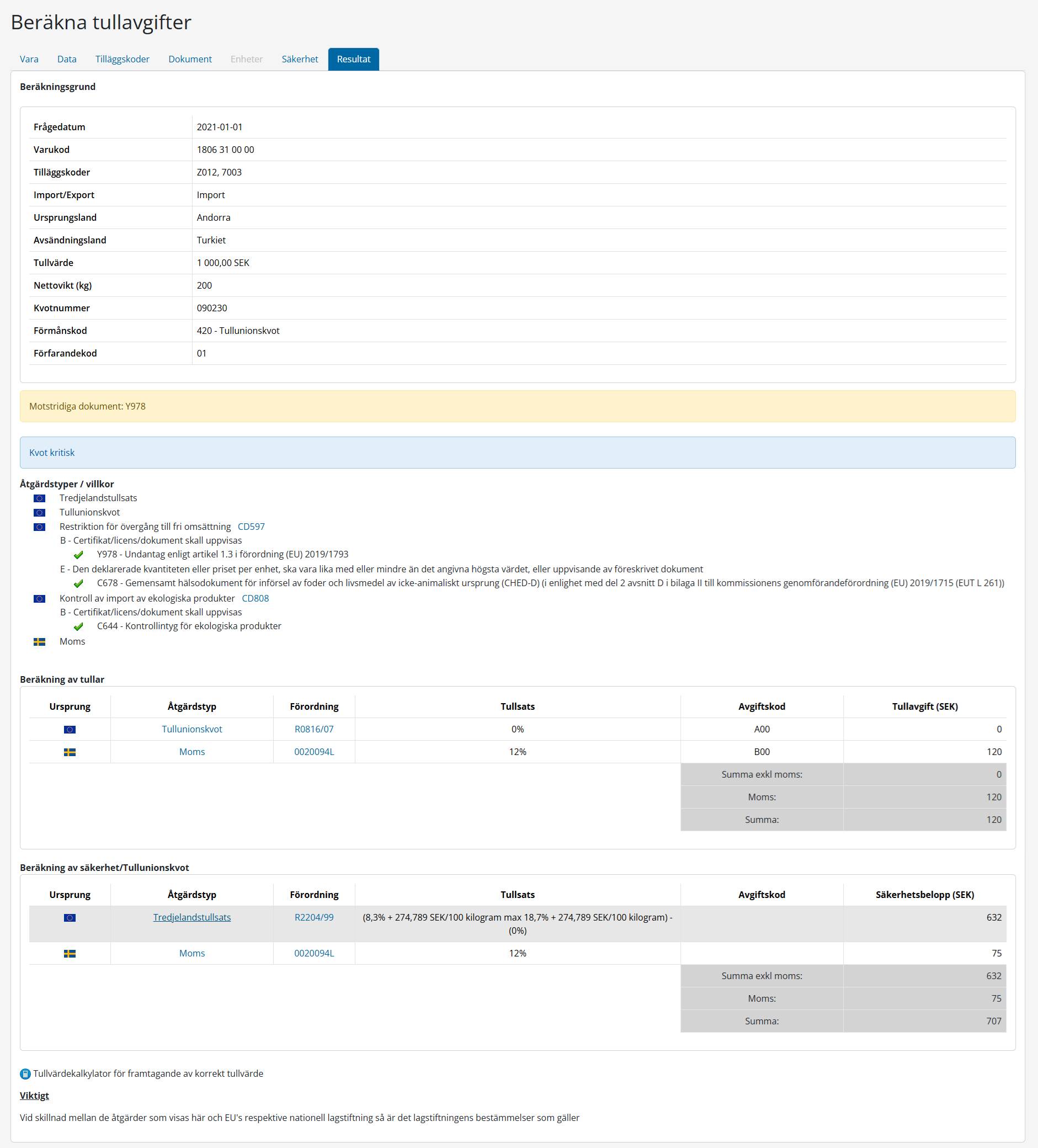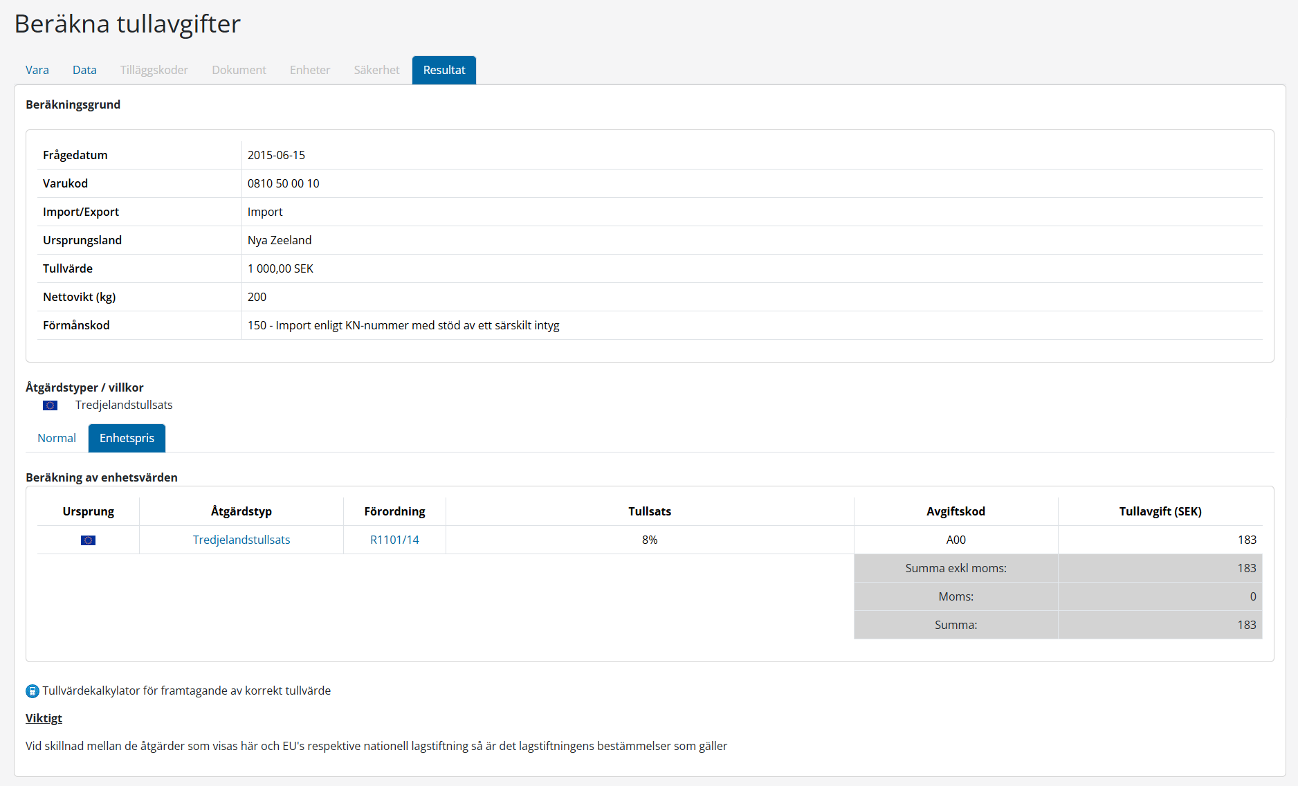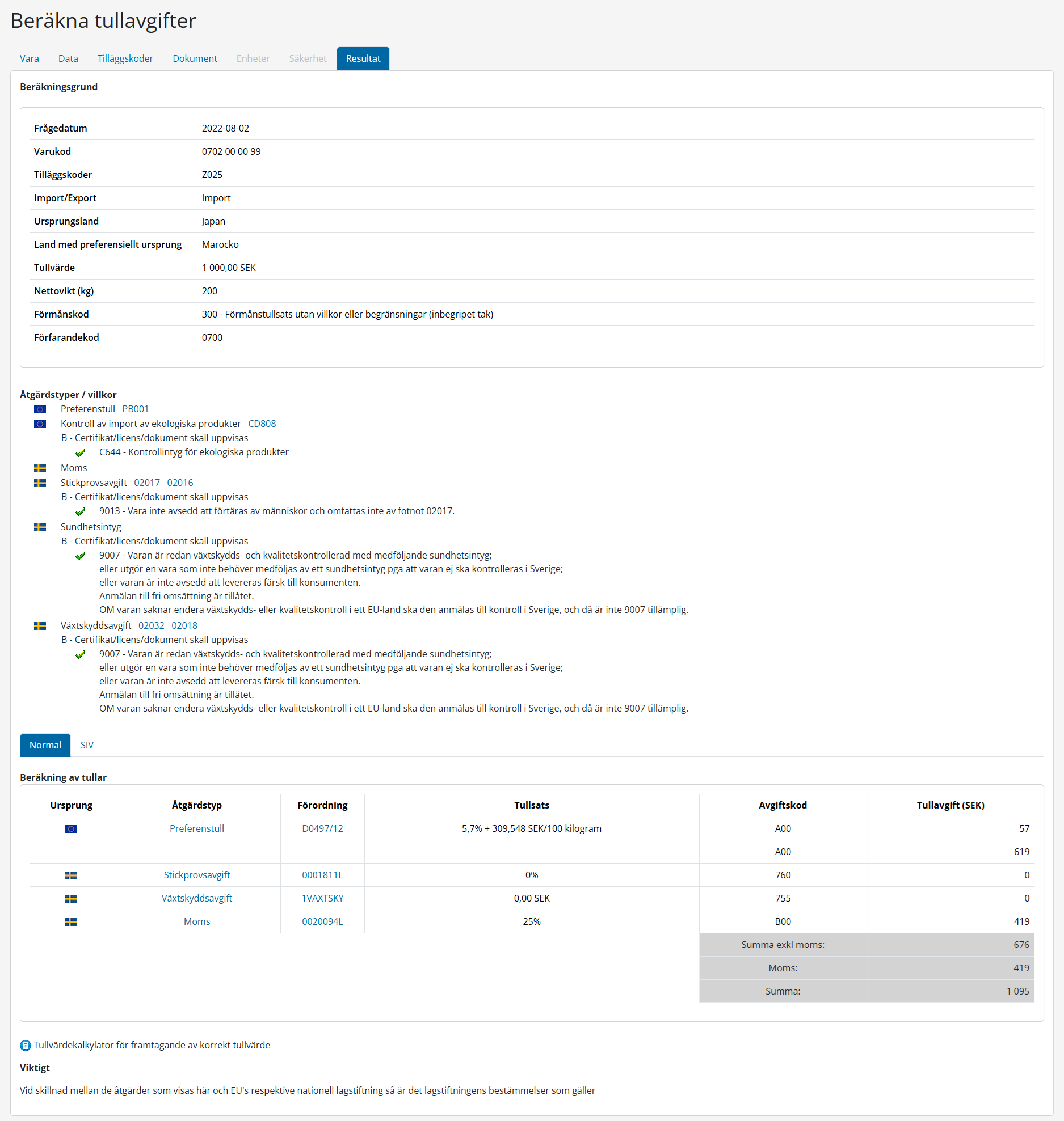 Den ”vanliga” fliken visar kalkyleringsresultat baserad på tredjelandstull och preferenstullar.