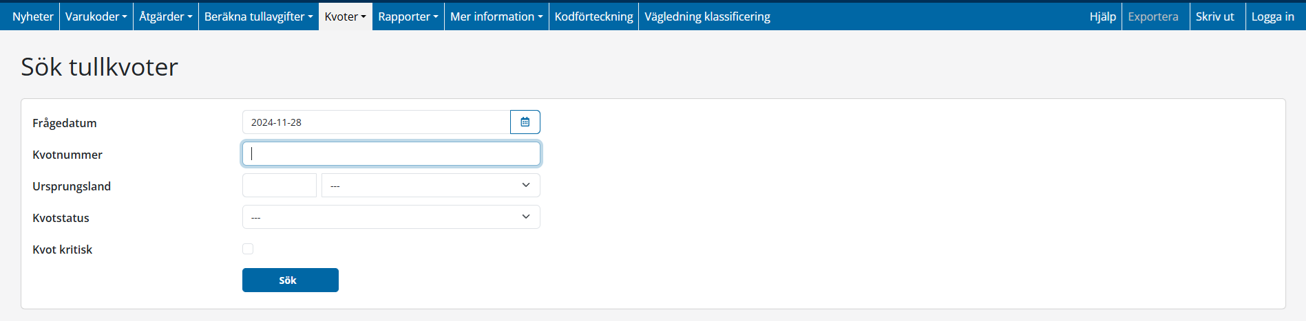 Klicka Kvoter menyn och sedan Sök tullkvoter i undermenyn.