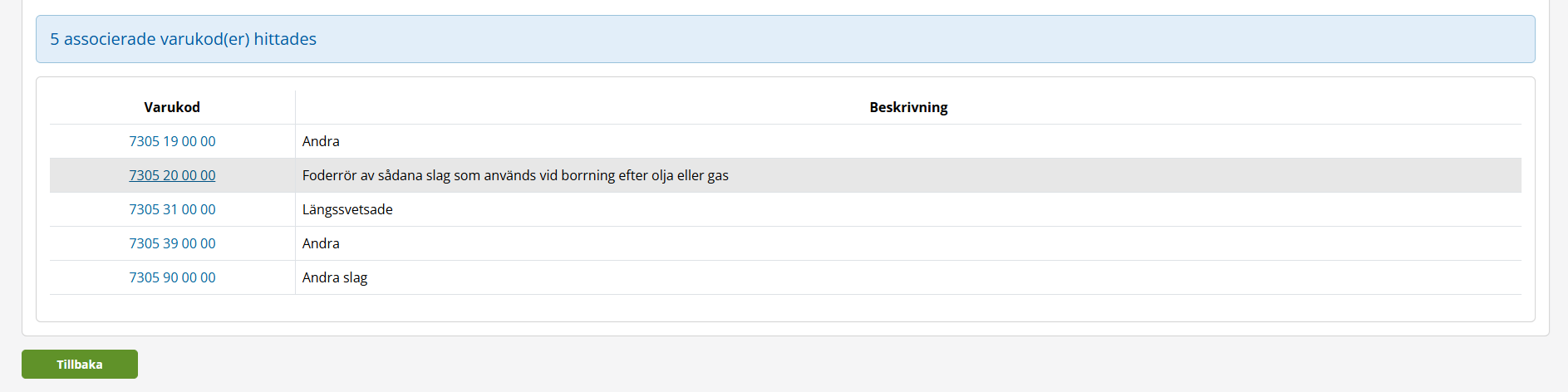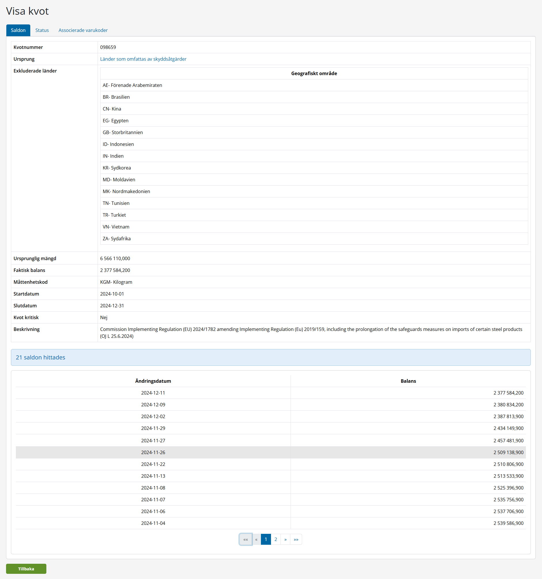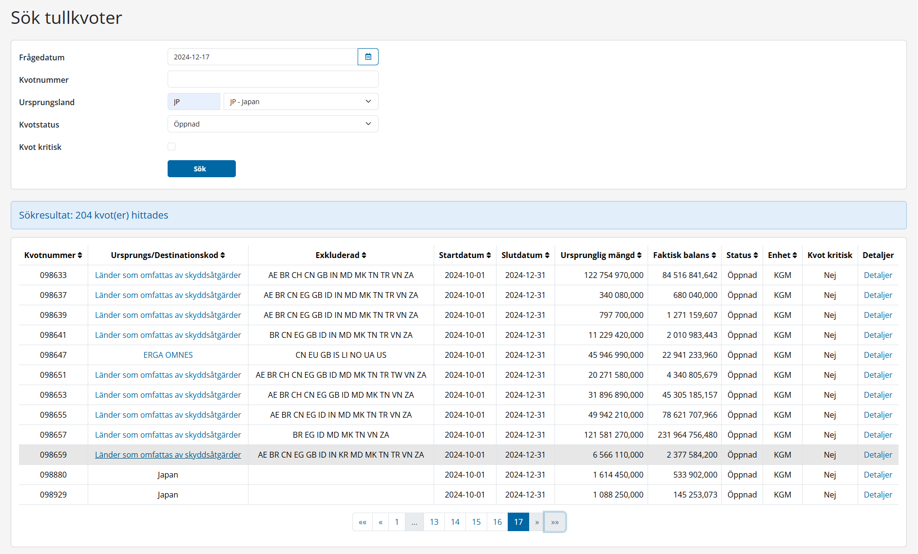 Exemplet ovan visas alla öppnade tullkvoter med frågedatumet för 2024-11-28 och Japan som ursprungsland.