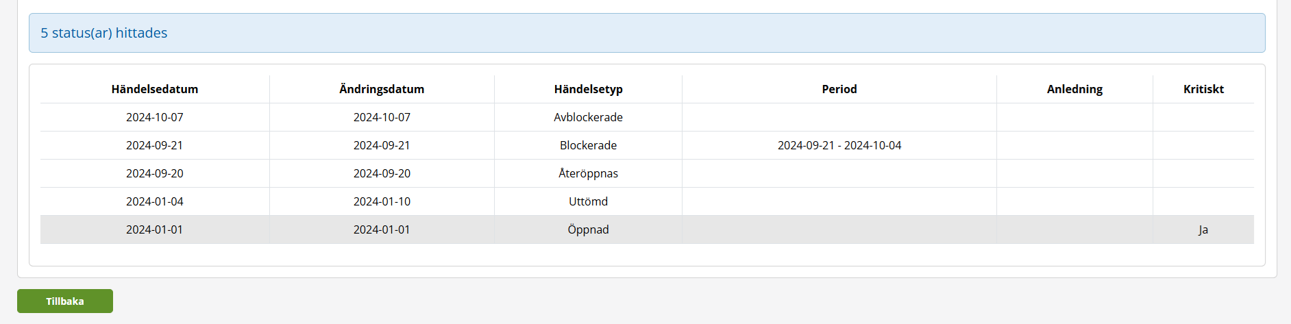 Fliken Status visar alla statusförändringar för vald kvot, även dessa sorterade på datum.